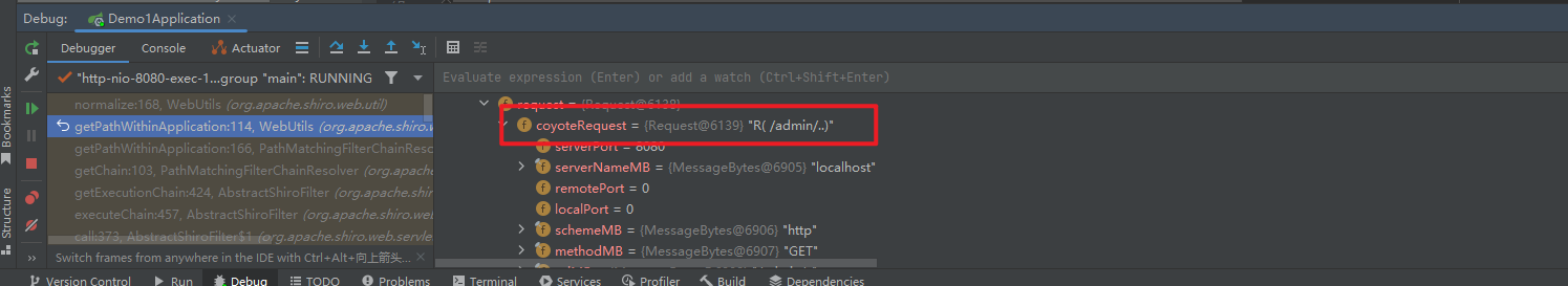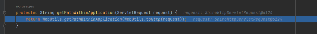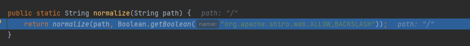 到这里shiro就把这个带有”/..”路径的请求变成了“/”,一般情况下根目录都是“anon”的访问权限,也就是说shiro放过了带有“/..”的请求