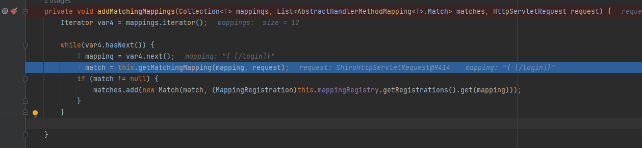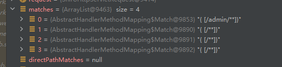 一步步往下走,走到addMatchingMapings,这里感觉就有第一个问题了,sping匹配“/admin/..”的结果匹配出了“/admin/**”和”/**‘’