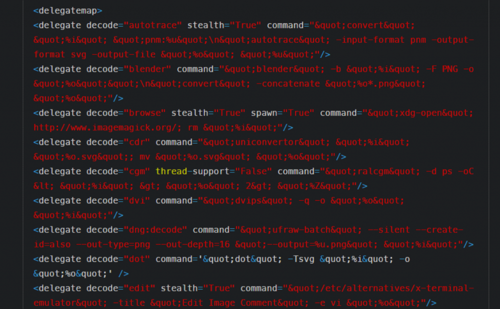 ImageMagick 委托的默认配置文件: /etc/ImageMagick/delegates.xml,类似以下这种定义格式: