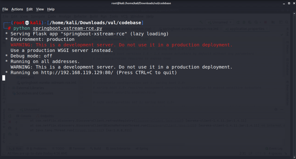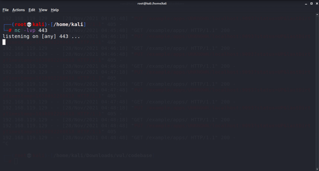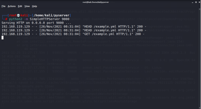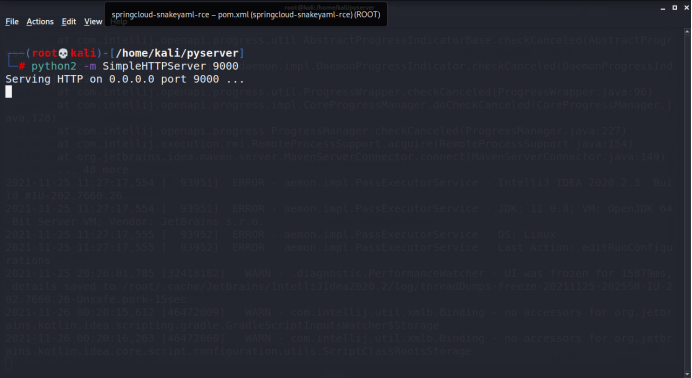 在kali上开放一个端口,模拟服务器2(受控服务器),部署example.yml(用于被受攻击服务器访问,调用.jar文件执行代码), yaml-payload.jar(执行代码)