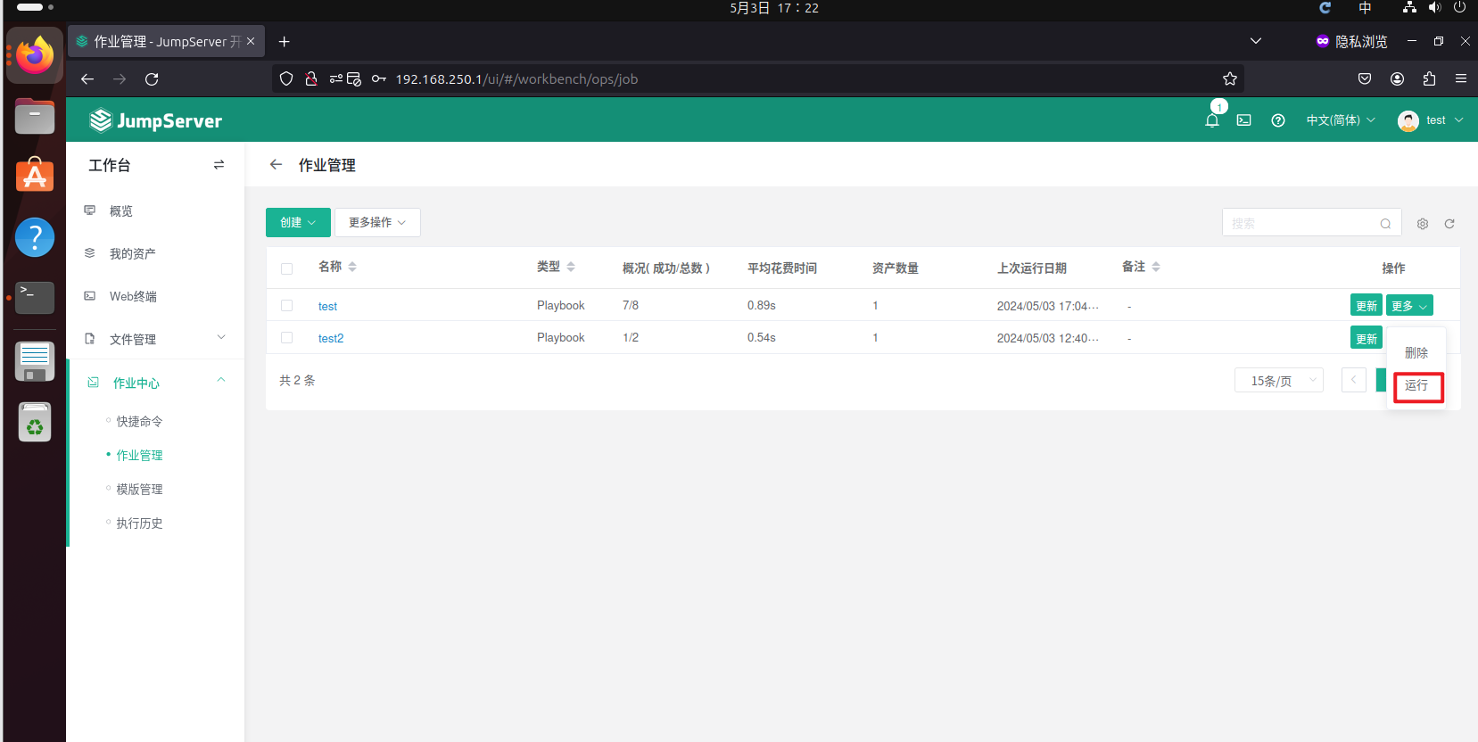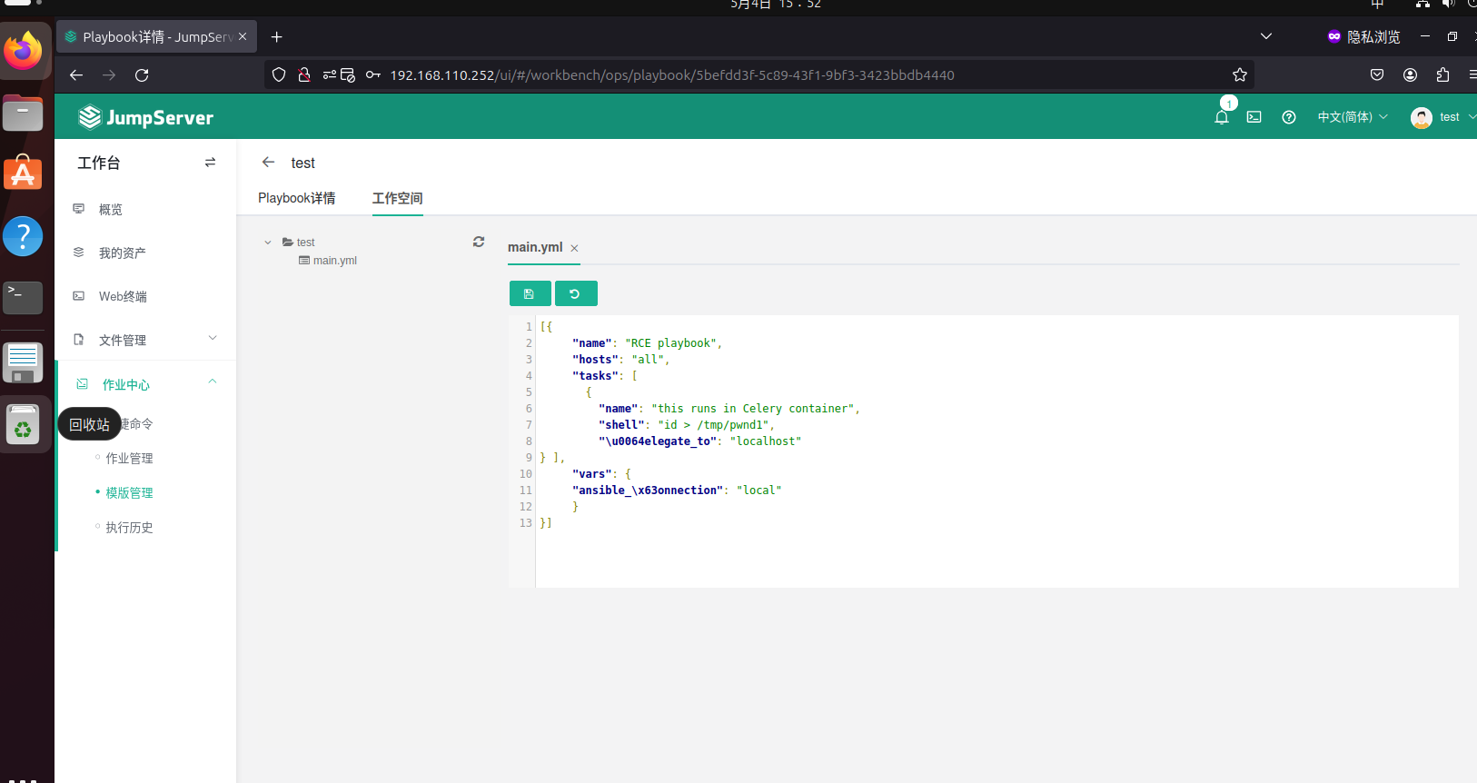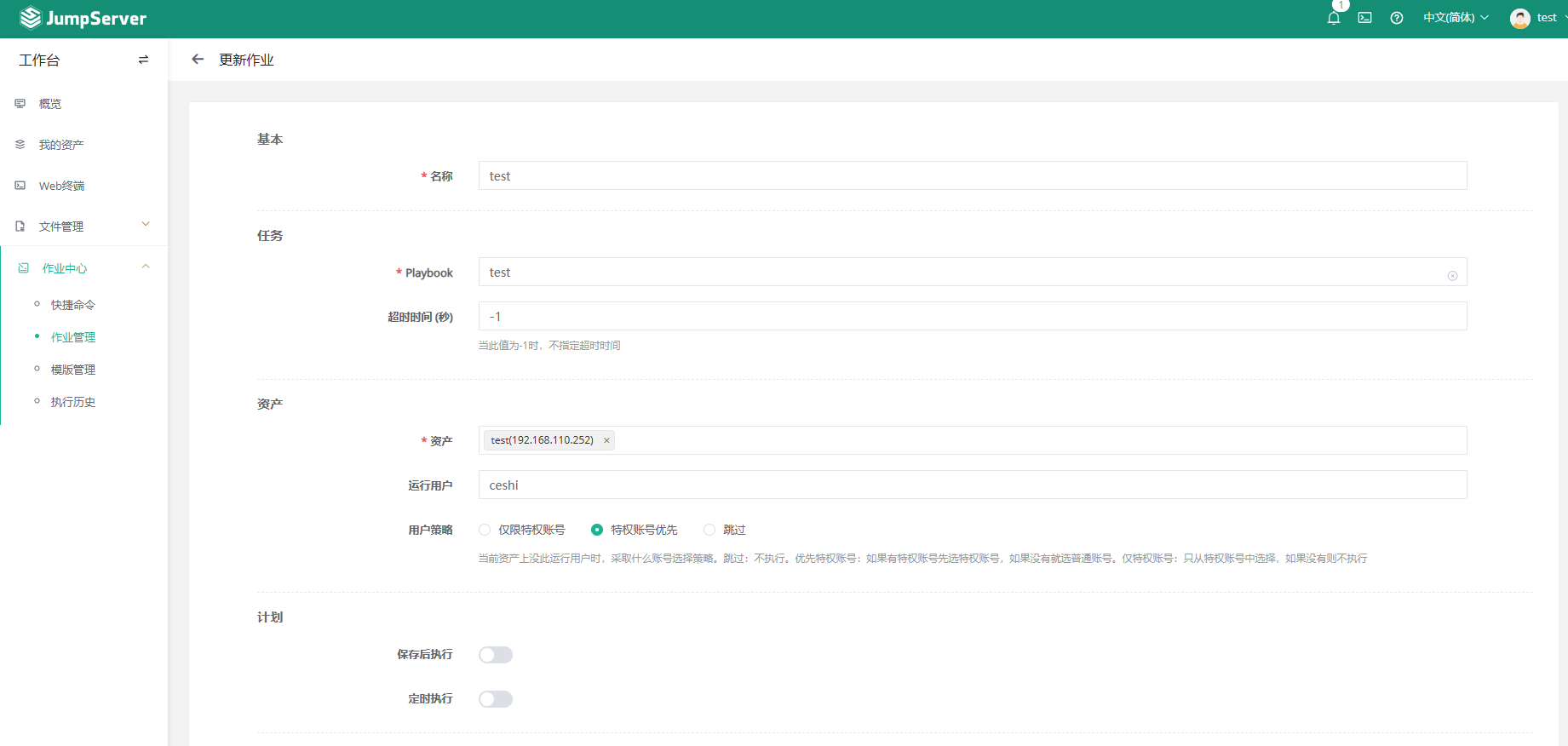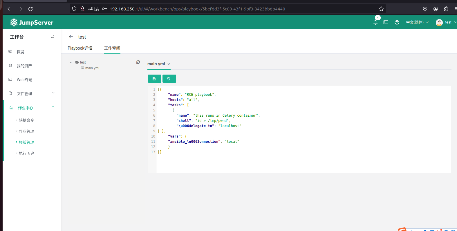 7、登录test账户,作业中心–模板管理–playbook管理–工作空间