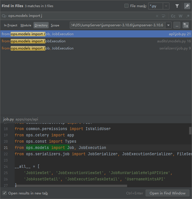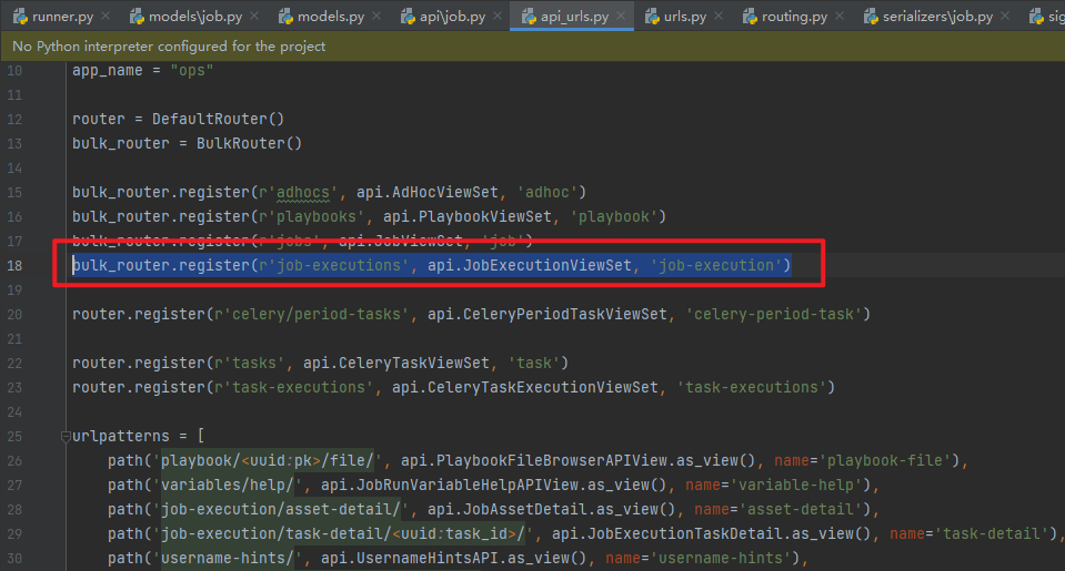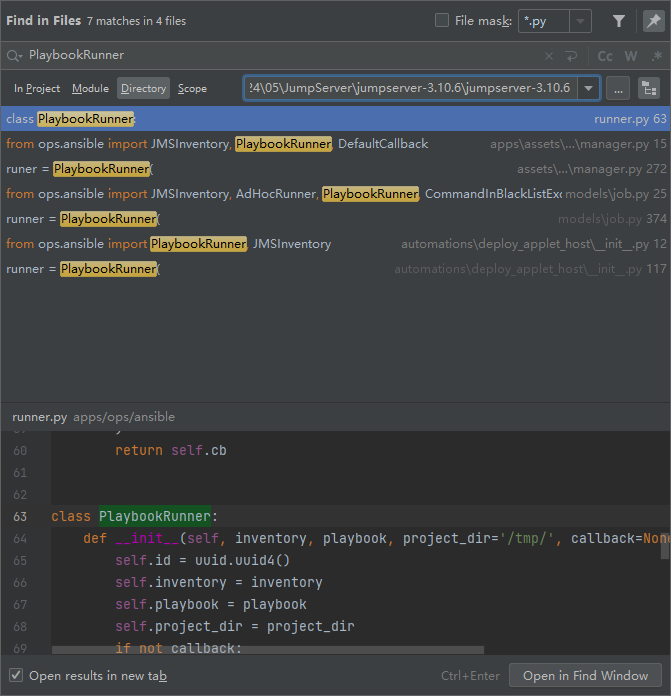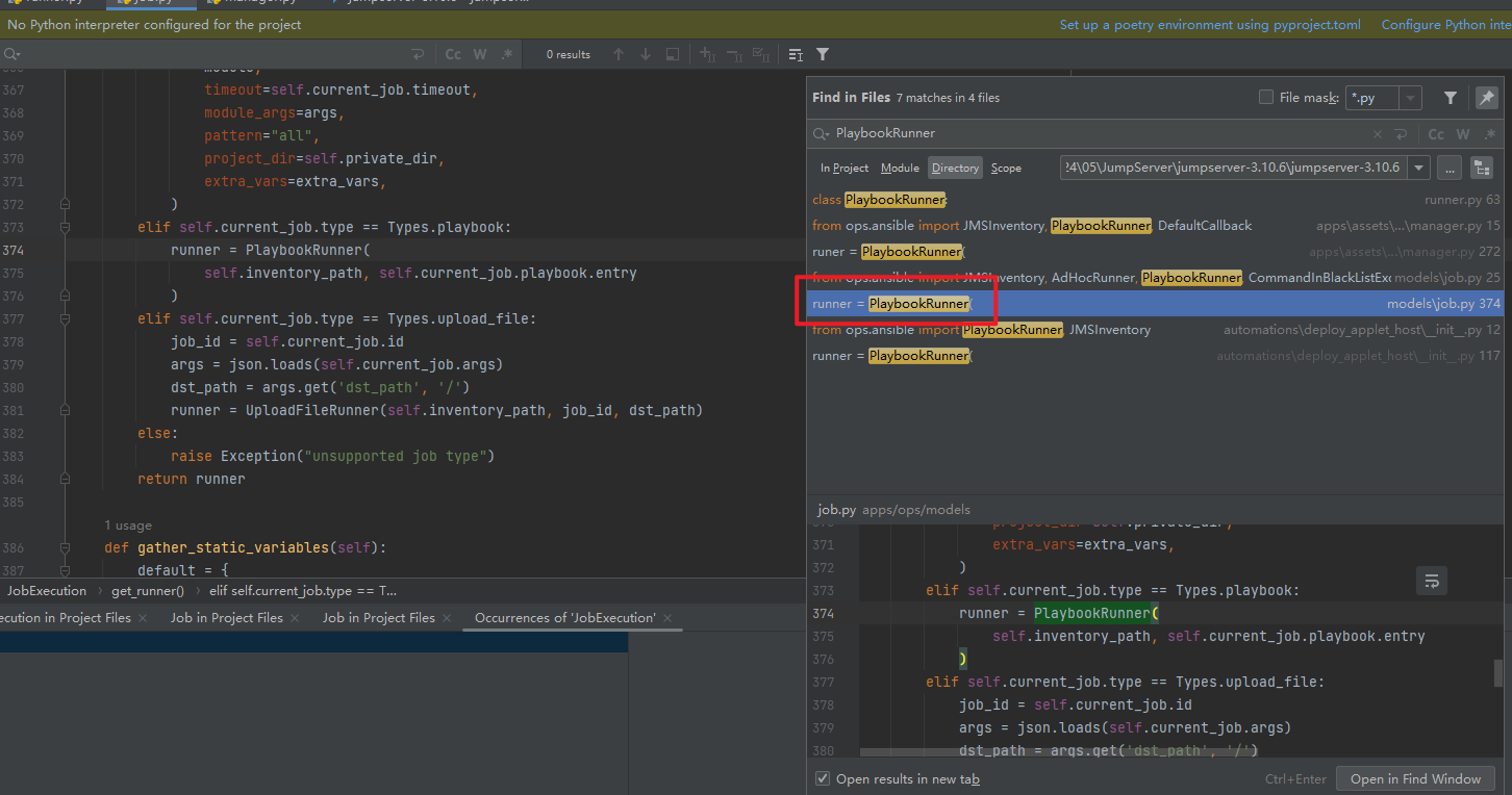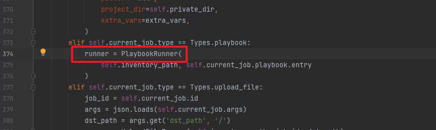 进一步搜索后,在job.py中发现了PlaybookRunner实例的创建,查看apps/ops/api/job.py,
