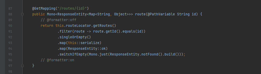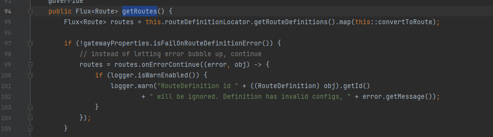 如果利用调试+打断点,最后可以确定变量的传递是loadGatewayFilters() -> getFilters() -> convertToRoute() -> getRoutes()