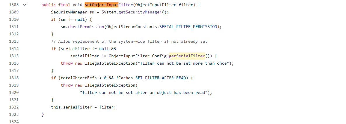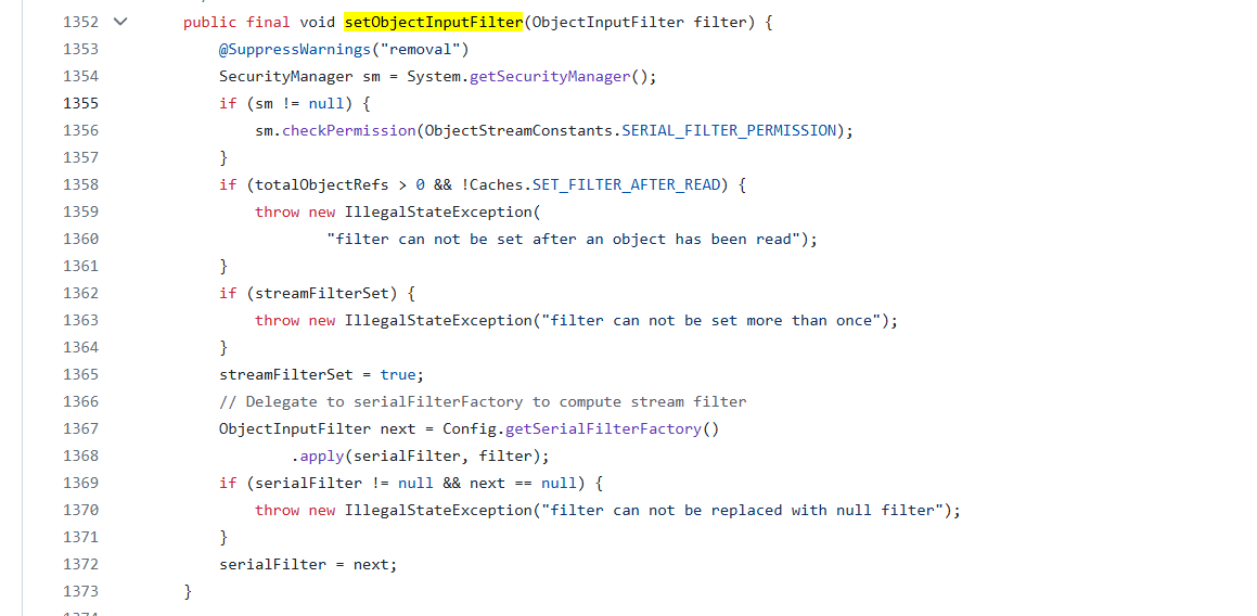 在这里确保了在对象已经开始反序列化后,不能再设置或更改过滤器。
