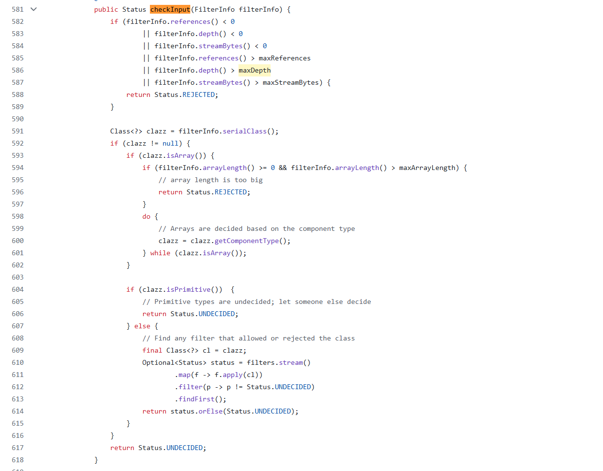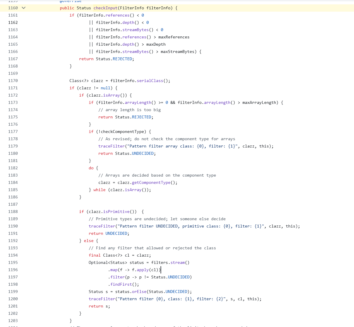 查看ObjectInputFilter#checkinput方法